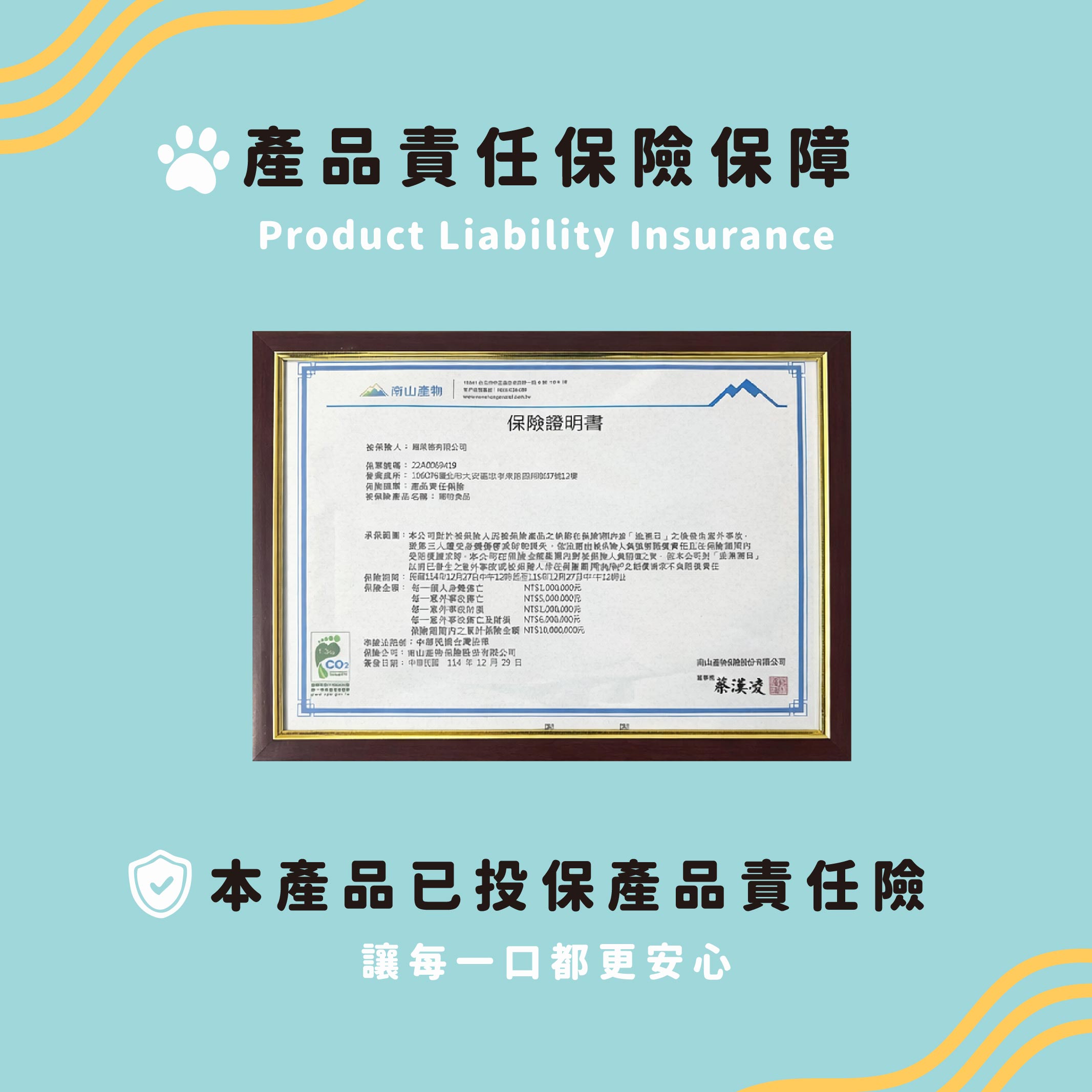 為了提供更完整的安全承諾,本公司已投保 產品責任保險新台幣一千萬元整。這不只是制度上的保障,更代表我們對產品品質ের信心與對毛孩健康的責任。
